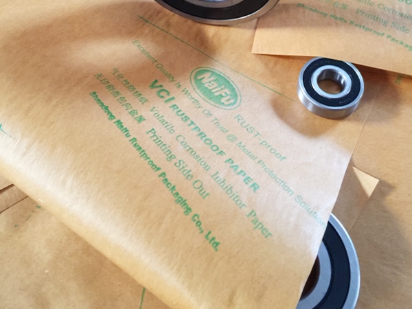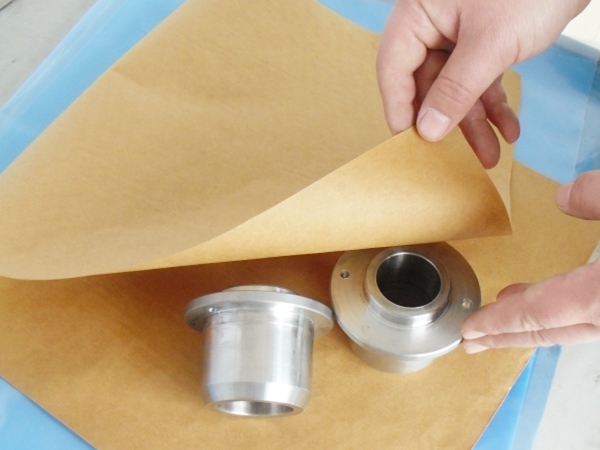 4、包裝過程---將含有緩蝕劑的面朝向金屬包裝,不覆膜防銹紙可作為金屬產品間墊層隔材使用,以免其他材質阻隔材料含S、CL化學成分,影響防銹效果